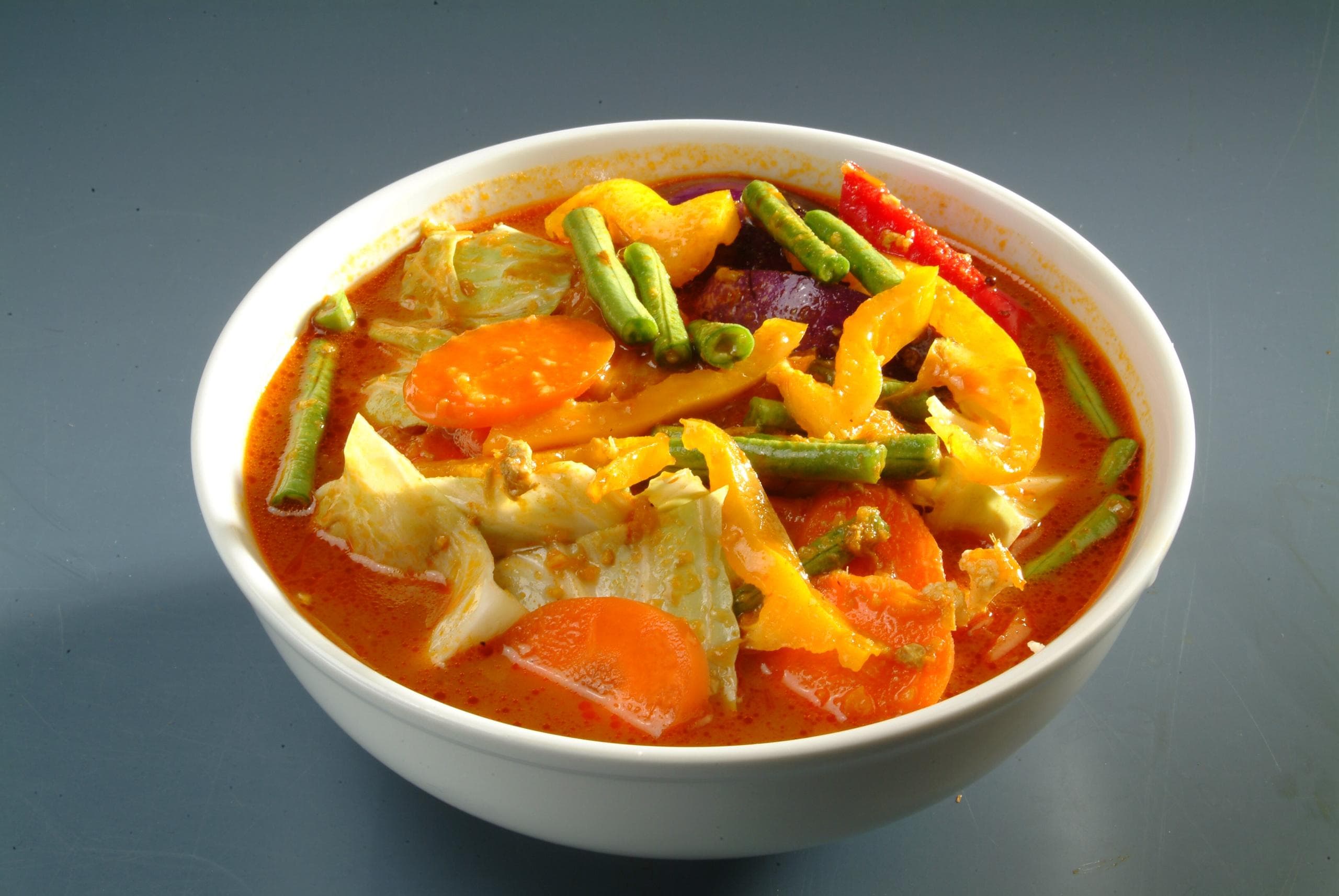 The first thing you'll notice about the mixed vegetable curry recipe is that it offers a lot of bright colours, and that's because the vegetables involved are so colourful! We've got a good mix of vegetables: pepper/capsicum, eggplant, long bean, okra and mushroom. This is a great recipe for a vegetarian curry lover, as the Khimyan Vegetarian Curry Paste is made with vegetarians in mind - there is no garlic and onion in the paste.